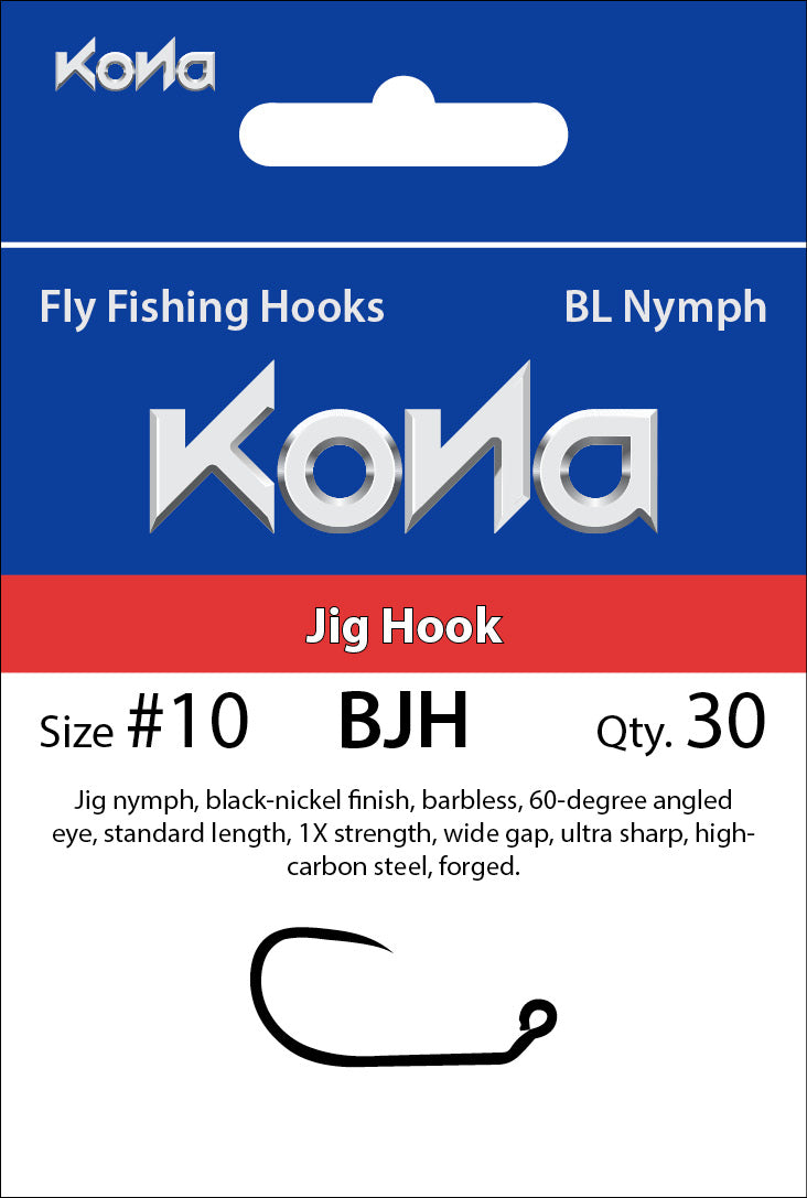 Specs: Jig nymph, black-nickel finish, barbless, 60-degree angled eye, standard length, 1X strength, wide gap, ultra sharp, high-carbon steel, forged.